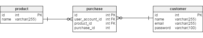 Now, we will design the relationship between these two tables. So to connect the customer and product table, we will create a table called purchase which will be like an order table (i.e., which customer ordered which product).