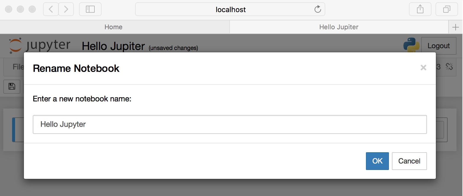 At the peak of the page is the word Untitled. This signifies the heading name for this current Notebook. Moving the mouse on top of the phrase Untitled and tick the text will prompt a dialog titled Rename Juypter Notebook. We could do with to mention a descriptive name here which defines the current book.