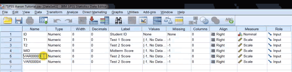 - Name: Enter the Unique Identifiable and Sorting Variable Name, Eg: In the Data of Students, The Variables can be ID, Sex, Age, Class, Etc; note: This will not allow any special character or Space while describing the variables of the Data, and Once you enter the First Variable, Immediately you can see SPSS generating all the other information regarding how you want to set that Variable that you have entered to be.