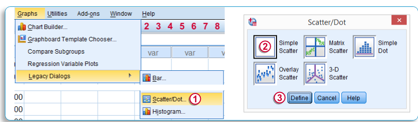 - Click Graphs……… Select Legacy Dialogs…….. Select Scatter/Dot.