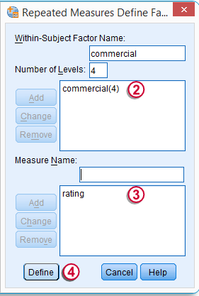 - In the Repeated Measures define Factor Dialog Box, we are going to explain the multiple variables that we are going to run.
