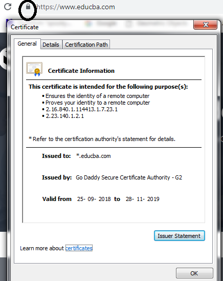 - Also, one can see many more details about the issuing authority of the SSL certificate and the corporate name of the website owner by clicking on the top left lock (i.e. padlock) symbol that appears on the browser bar.