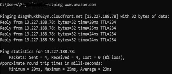 It is used detecting devices on network and troubleshooting network problems. It will help to see the connection between your device and another device on the network. If we receive a reply from the device then the device is working properly. We can use this command with an IP address and hostname. We have searched for the Amazon website. 0% data loss while sending the number of packages. Success result is present n round trip times in milliseconds.