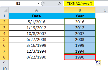 Get the YEAR values from the below-given dates by using the TEXT function.